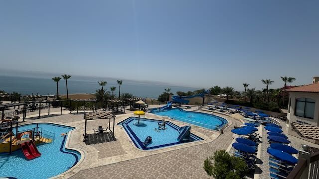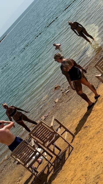 After breakfast, we set off on the long journey north to the Dead Sea after first stopping at Aqaba to stand in Jordan looking at the Red Sea in front of us with Saudi Arabia to our left, Egypt in front on the other side of the Red and Israel to our right. We arrived at the creatively named Dead Sea Resort, with luxurious rooms and a great choice of restaurants and bars, a chance to grab a cold beer after a long ride!